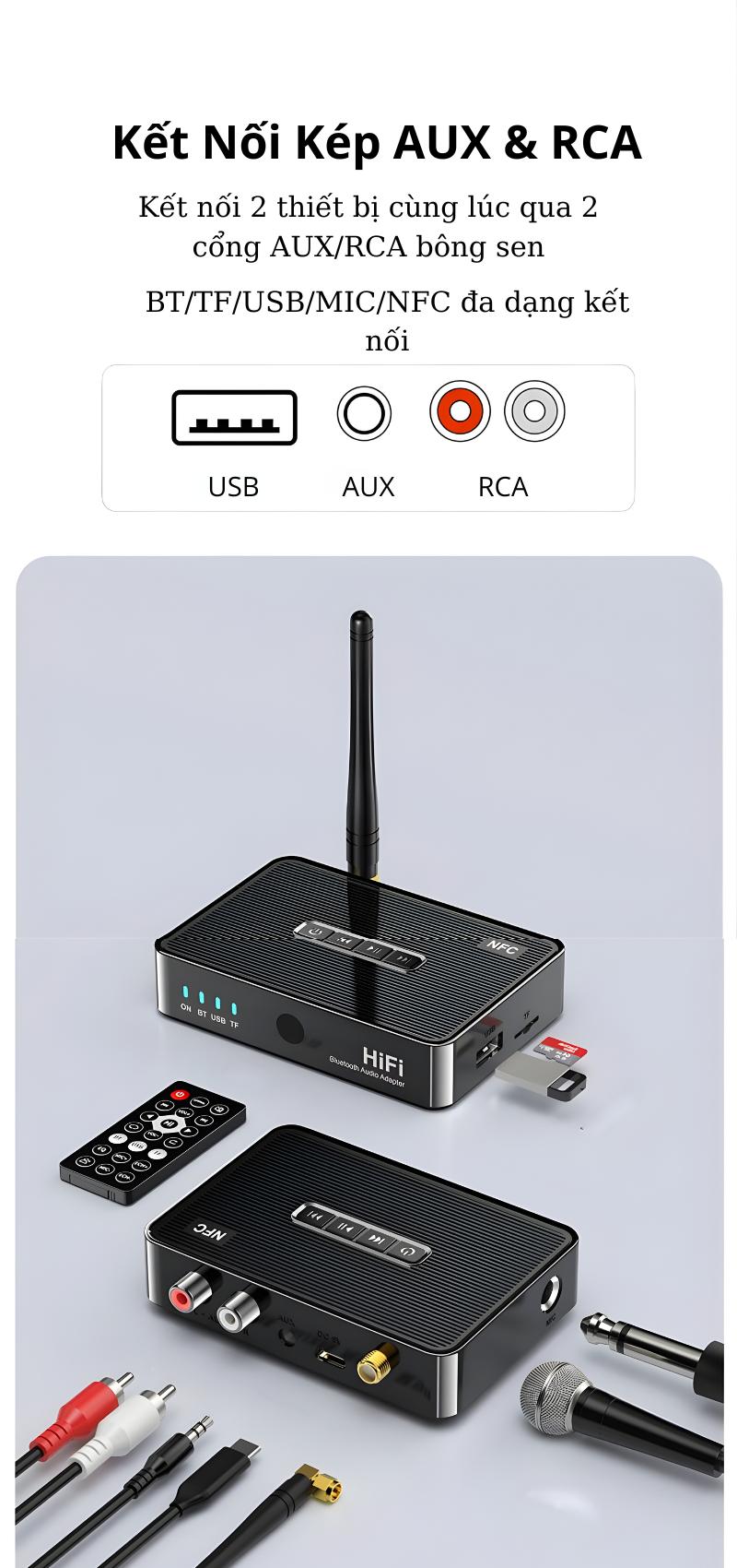 2 cổng AUX & RCA riêng biệt: Kết nối đồng thời 2 thiết bị – tiện lợi cho TV, ampli, loa.