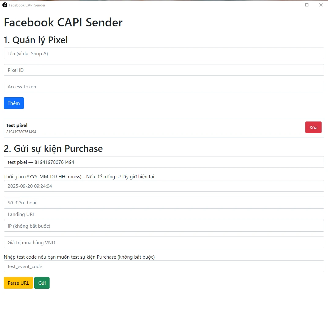 Điểm đặc biệt của phần mềm là bản Portable — chạy ngay không cần cài đặt, gọn nhẹ, dễ sử dụng trên mọi máy tính. Người dùng chỉ cần mở ứng dụng, thêm Pixel ID, sau đó tạo sự kiện Purchase dựa trên các thông tin thực tế như: