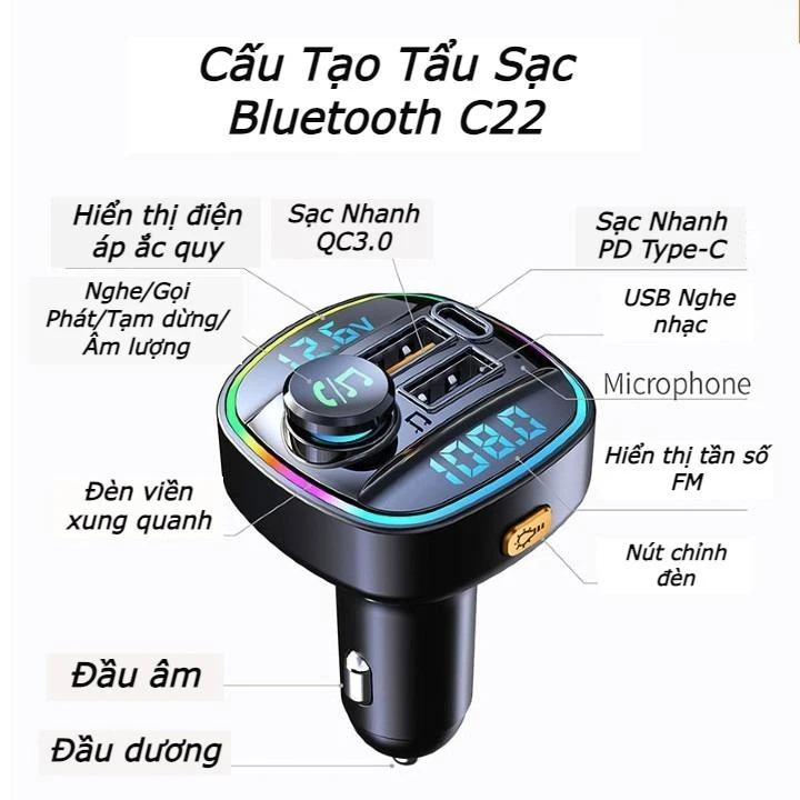 -Tẩu Sạc Bluetooth C22 Xe Hơi Bluetooth 5.0 Bộ Phát Fm Qc3.0 PD20W Sạc Nhanh Mp3 Người Chơi Cho Ô Tô Mới Màn Hình Hiển Thị Kép Phát Hiện Điện Áp