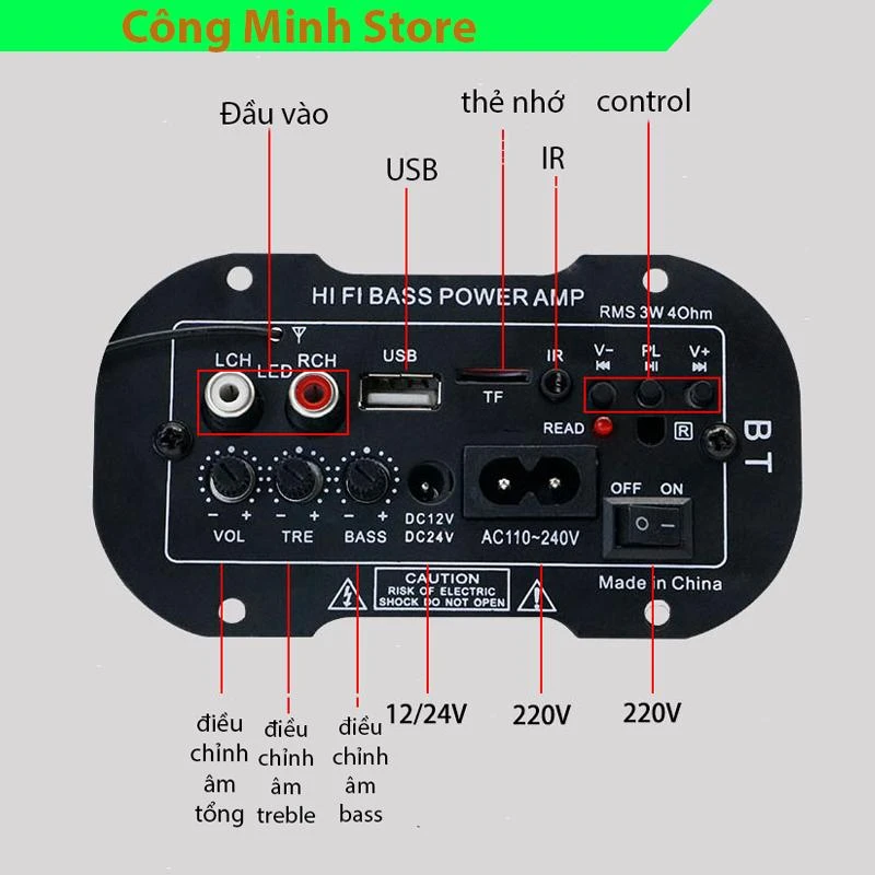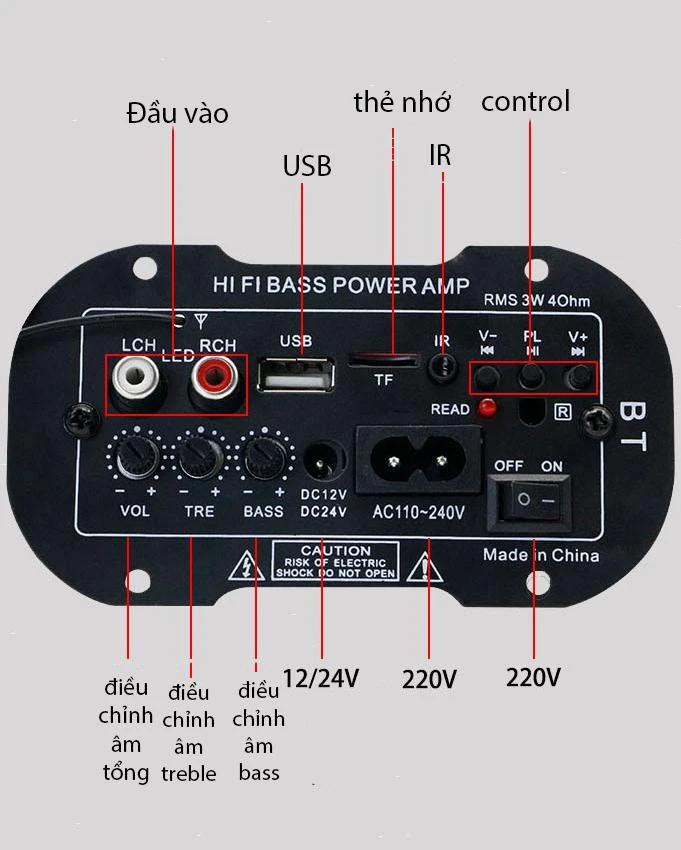 Tặng kèm: Bộ nguồn AC, điều khiển, 2 dây jack bass treble, chân nguồn DC